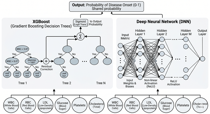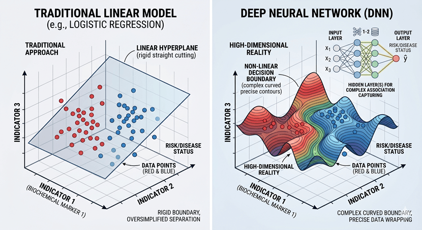 To be honest, both XGBoost and DNNs achieve the same fundamental goal here. They discard the outdated “single-variable threshold” method and instead construct a multidimensional decision boundary. By mathematically digesting the interactions among dozens of blood markers simultaneously, they can spot the biological precursors of a disease long before it causes any physical symptoms.