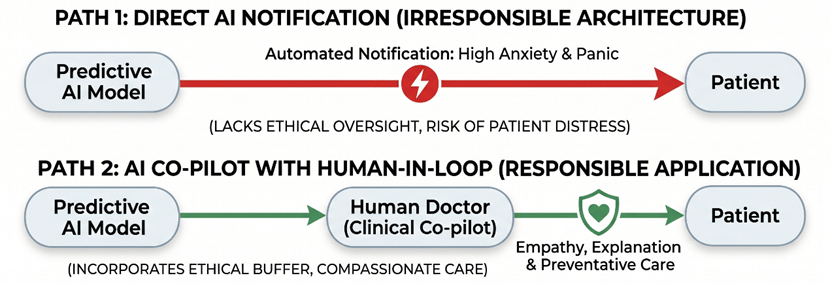 Figure 9: Comparison of Healthcare AI Deployment Architectures: Direct Automated Notification vs. Human-in-the-Loop (HITL) Ethical Buffer.
