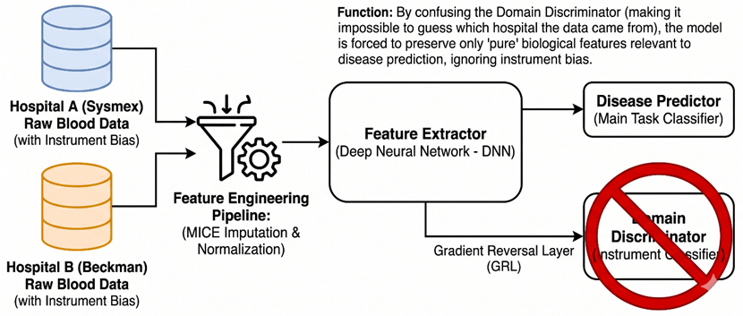 Furthermore, we implement Representation Learning techniques directly within our neural network architectures. For instance, we can utilize Domain-Adversarial Neural Networks (DANN). The objective here is to force the hidden layers to extract data features that are highly predictive of the disease, but entirely invariant to the source instrument. We are basically forcing the network to mathematically strip away the “microphone distortion” and only listen to the biological “melody” [13].