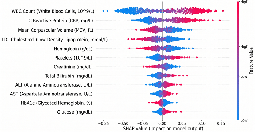 Figure 8: SHAP plot illustrating the contribution of key blood biomarkers to the disease prediction model.
