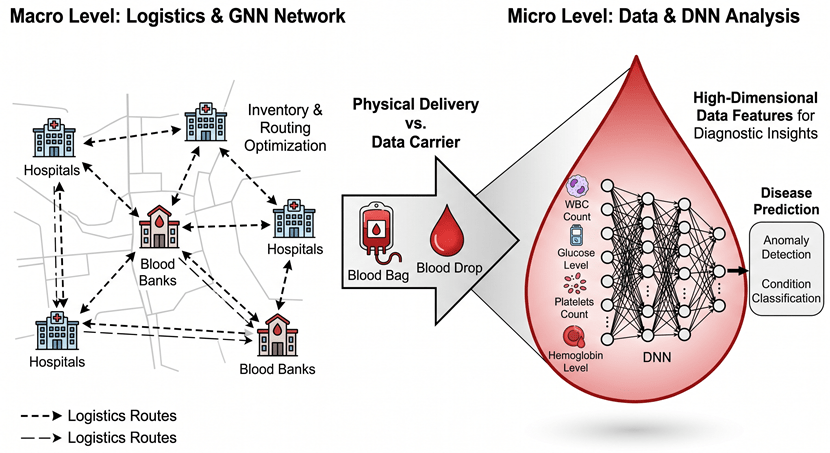 But here is the catch. While algorithms like GNNs efficiently ensure a bag of blood reaches the emergency room exactly when needed, they treat the blood purely as a consumable commodity. Actually, viewing blood just as a liquid for physical transfusion severely underestimates its potential. Blood samples are also a massive data carrier that contains the health status of our whole body.